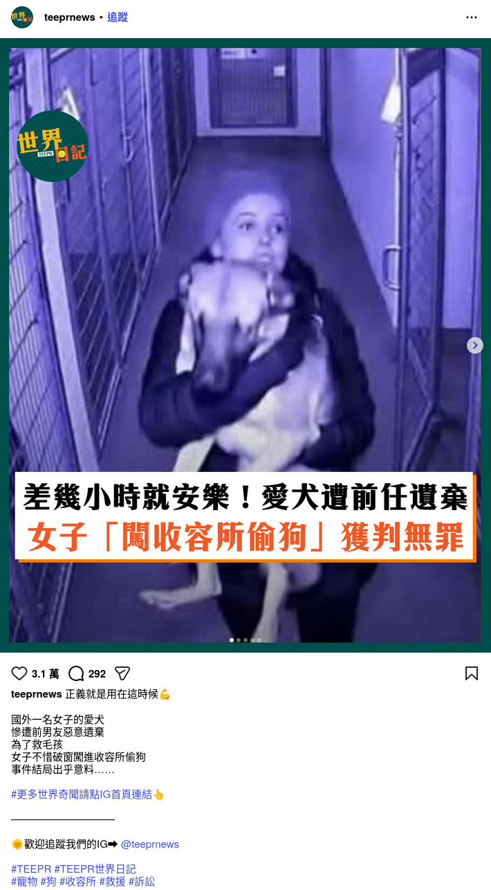 2026年1月31日,網站「TEEPR 亮新聞」發佈Instagram帖文,宣稱國外一名女子的寵物狗遭前男友遺棄,在收容所即將被終止生命,該女子破窗闖進收容所救出狗隻後被起訴,但法官撤銷了訴訟並向其前男友發出逮捕令。帖文附上多張圖片,其中一張看似監視器畫面、顯示一名女子抱着狗,另一張顯示有人打開門並把背囊掛在手上。帖文獲得3.1萬個讚好及292個留言。[1]